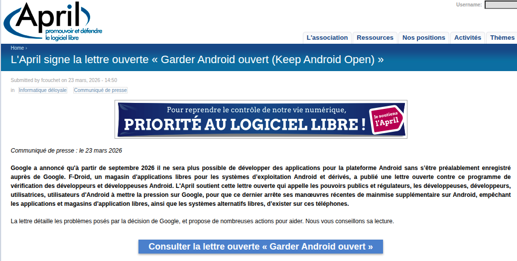 Dans un récent article, l’April indiquait avoir signé la lettre ouverte « Garder Android ouvert » et synthétisait les deux informations importantes à retenir. « Cette nouvelle initiative de Google qui met en danger l’existence d’applications et magasins d’applications libres sur Android, arrive seulement quelques mois après l’annonce en mars 2025, par Google, d’une fermeture de la manière […]
